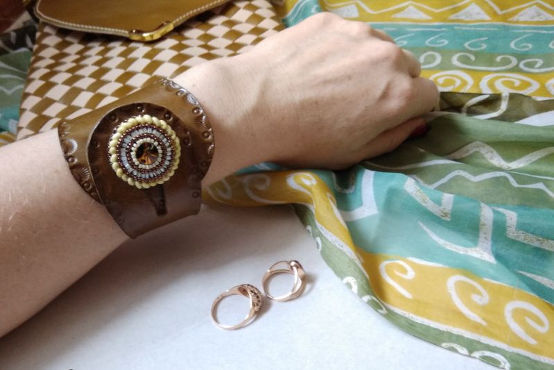 Браслет на жёсткой основе. Процесс создания браслета из кожи и бисера.