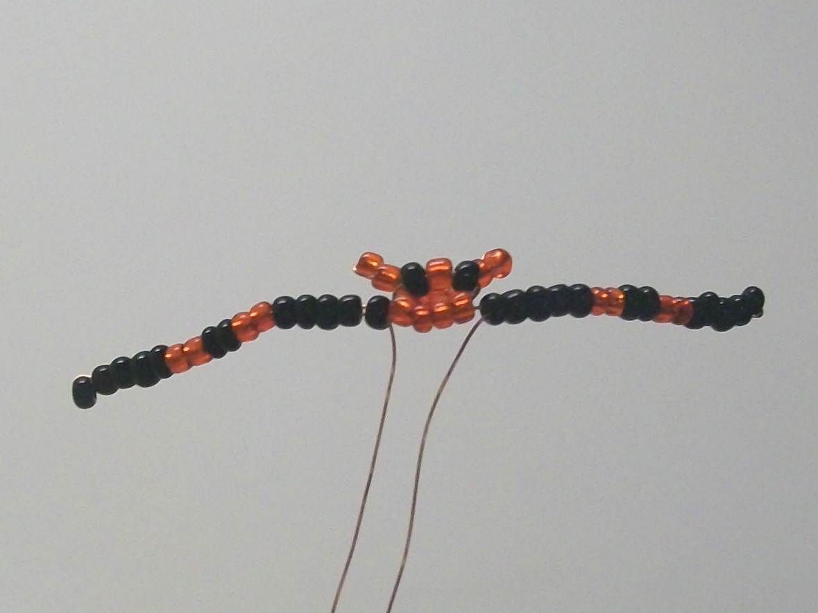 Начинайте нанизывать бисер на нитку, следуя контуру паучка. Придайте желаемую форму телу и ногам.