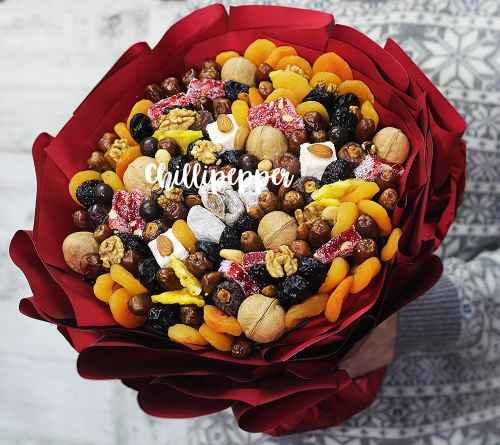 Выберите качественные и свежие орехи и сухофрукты, чтобы букет выглядел не только красиво, но и был вкусным.