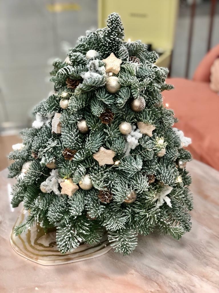 Декорируйте елочку из нобилиса при помощи конфетти, шелковых лент и естественных элементов, таких как шишки и ягоды.